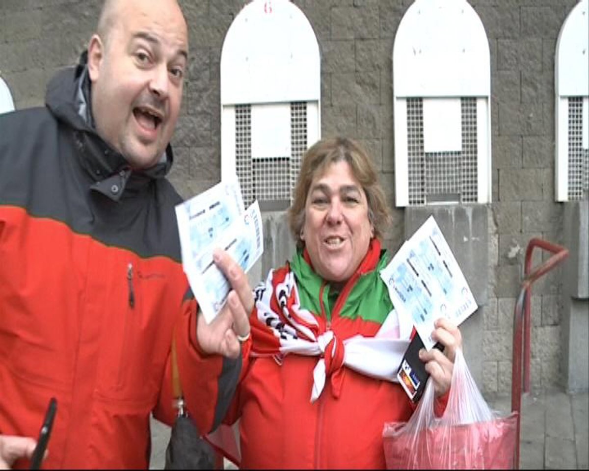Los dos primeros aficionados del Athletic en conseguir esta mañana las últimas entradas que el club ha puesto a la venta para el partido que esta noche enfrentará al conjunto bilbaíno con el Mirandés, a las 22.00 horas, en semifinales de Copa del Rey llevaban 24 horas guardando cola.