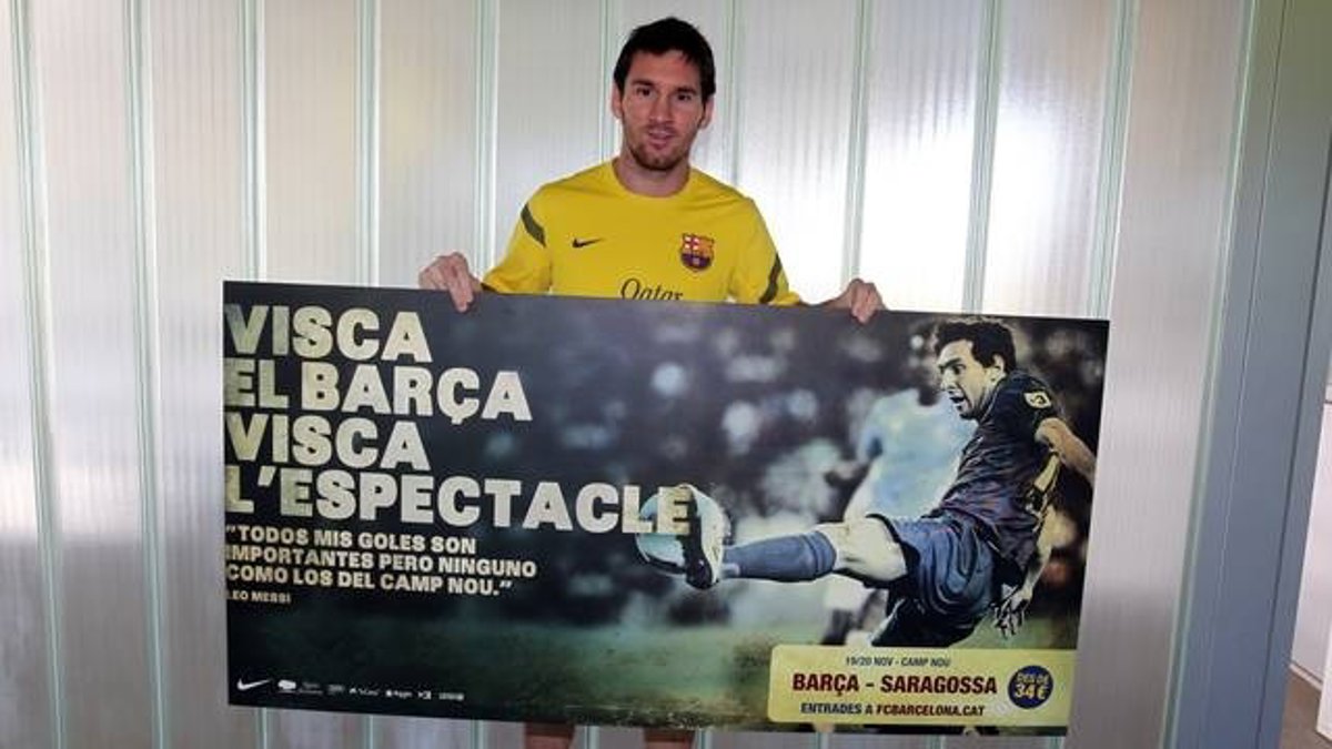 Este sábado, contra el Real Zaragoza, los primeros protagonistas serán Cesc Fàbregas y un Leo Messi que reza el siguiente lema: "Todos mis goles son importantes pero ninguno como los del Camp Nou. 'Visca el Barça i visca l'espectacle'".