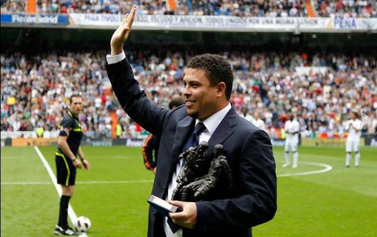 El ex delantero brasileño Ronaldo Nazario de Lima recibió este sábado el homenaje del Real Madrid y de la afición madridista en los instantes previos al partido que enfrenta al conjunto blanco con el Sporting de Gijón, debido a su contribución como jugador merengue.