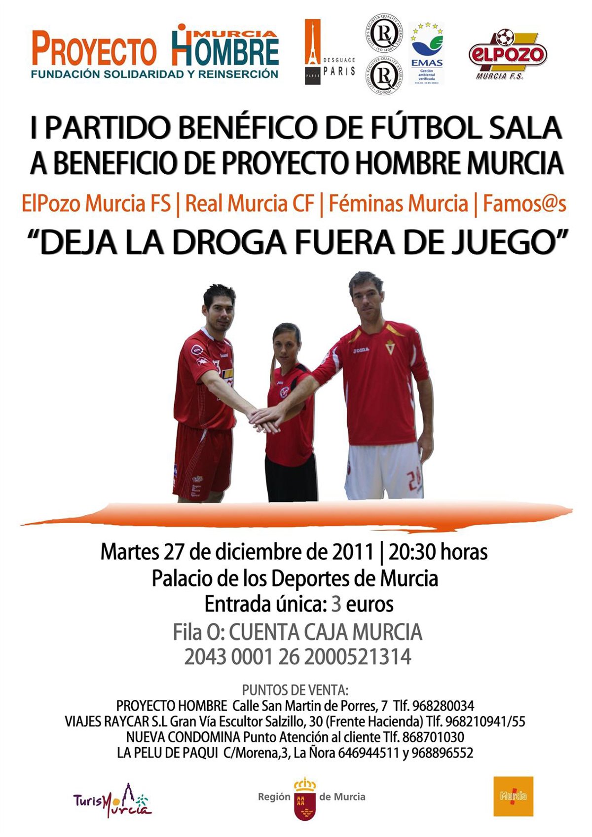 ElPozo Murcia, el Real Murcia, el Féminas Murcia y una amplia nómina de famosos participarán este martes en el I Partido de Fútbol Sala a beneficio de 'Proyecto Hombre Murcia', que tendrá lugar en el Palacio de los Deportes de Murcia (20.30 horas).