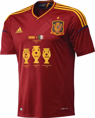 La camiseta oficial de juego de Adidas rinde homenaje a las victorias conseguidas, incluyendo la leyenda oficial de la final contra Italia situada en el centro del pecho. Además, en la prenda figura un gráfico conmemorativo de las tres Eurocopas ganadas por la selección, así como la información relativa al año en que se celebraron y la ciudad en que se jugó cada final.