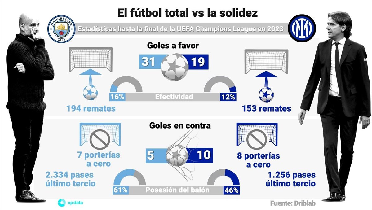 Mientras que en ataque no tiene unos números sobresalientes, el equipo italiano sí presume de su esfuerzo en tareas defensivas, con 114 intercepciones a disparos de sus rivales en Champions, por las solo 74 del City. Un estilo más directo y pragmático que intentará neutralizar el dominio y superioridad de los ingleses que parecen abrumadores, con la 'Orejona' como ansiado botín.