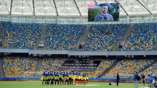 Los jugadores del Shakhtar Donestk y el Metalist Kharkiv durante el homenaje a las víctimas de la guerra celebrado en la previa al primer partido tras la reanudación de la Premier League - SHAKHTAR DONESTK