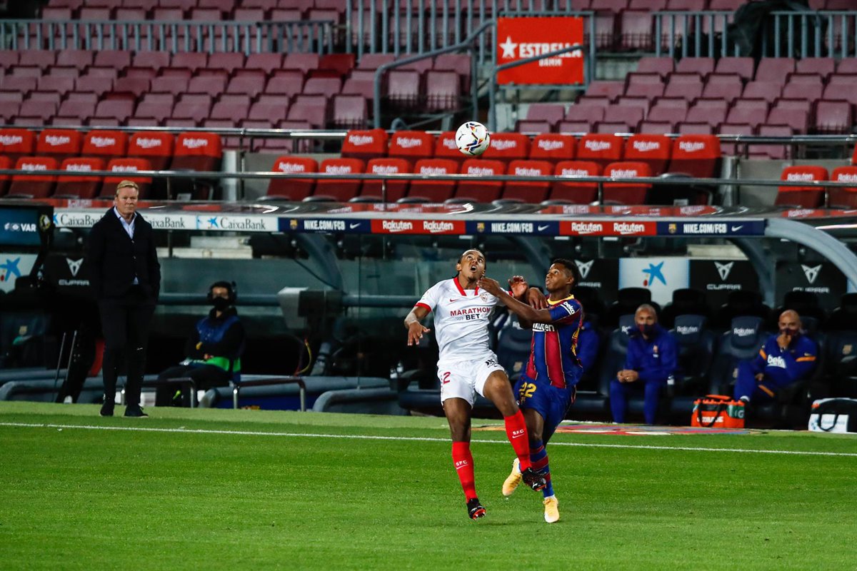 12 Kaunde of Sevilla FC and 22 Ansu Fati of FC Barcelona during La Liga match between FC Barcelona and Sevilla FC at Camp Nou Stadium on October 04, 2020 in Barcelona, Spain. - Xavi Bonilla / AFP7 / Europa Press