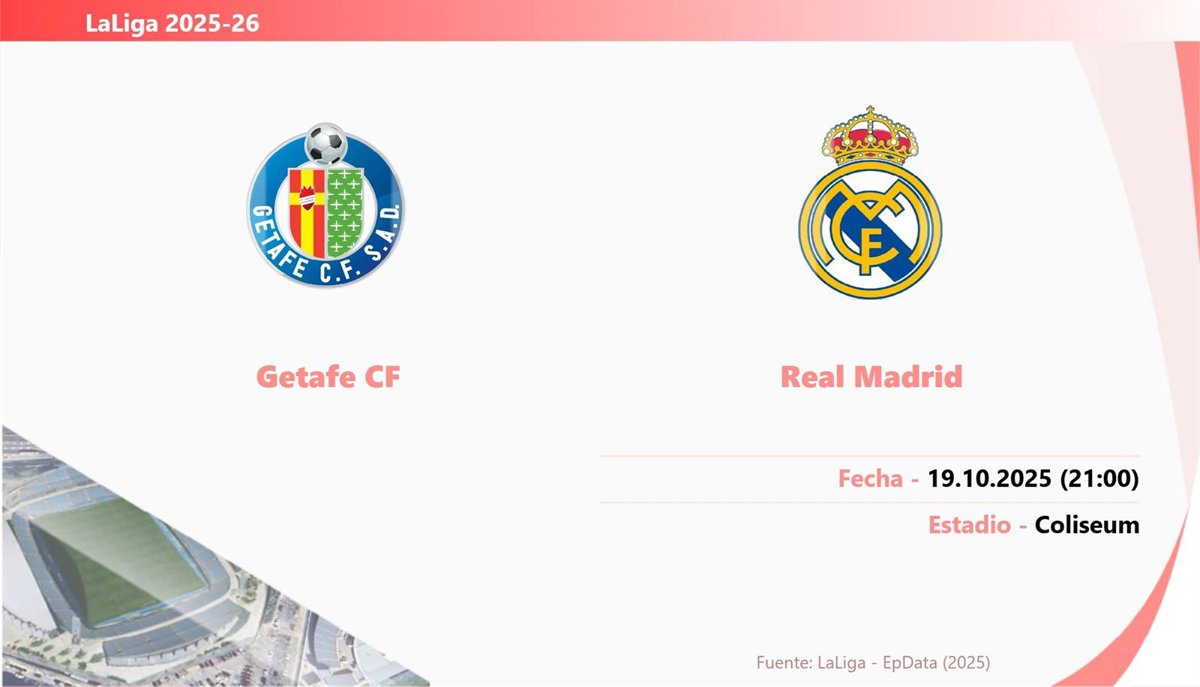 El partido que enfrenta a Getafe y Real Madrid de la jornada 9 de LaLiga EA Sports 2025-26 se disputará el domingo 19 de octubre a las 21.00 horas en el Coliseum.