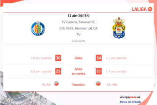 En el ámbito ofensivo, el equipo amarillo tiene mejores números que los del sur de Madrid en goles por partido con 1,1 goles por encuentro del primero frente a 1 del segundo. En cuanto a la calidad de las ocasiones de gol generadas, el equipo canario también supera a los getafenses con 0,9 goles esperados frente a 0,8, según las estadísticas de Driblab consultadas por Europa Press.