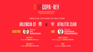 En el VAR estará el catalán Xavier Estrada Fernández, con Santiago Jaime Latre como AVAR. En el duelo de ida, en San Mamés, Athletic y Valencia empataron (1-1).