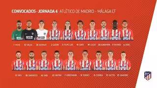 La convocatoria al completo del Atleti para recibir al Málaga está formada por: Moyá, Oblak y Werner; Godín, Filipe Luis, Savid, Lucas, Juanfran, Thomas, Gabi, Koke, Saúl, Carrasco, Gaitán; Griezmann, Correa, Vietto, Fernando Torres y Kevin Gameiro.