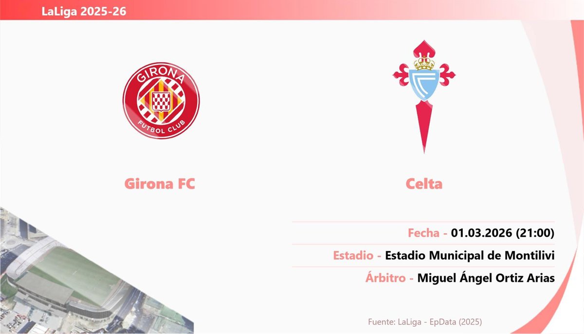 El partido que enfrenta a Girona y RC Celta de la jornada 26 de LaLiga EA Sports 2025-26 se disputará el domingo 1 de marzo a las 21.00 horas en Montilivi.