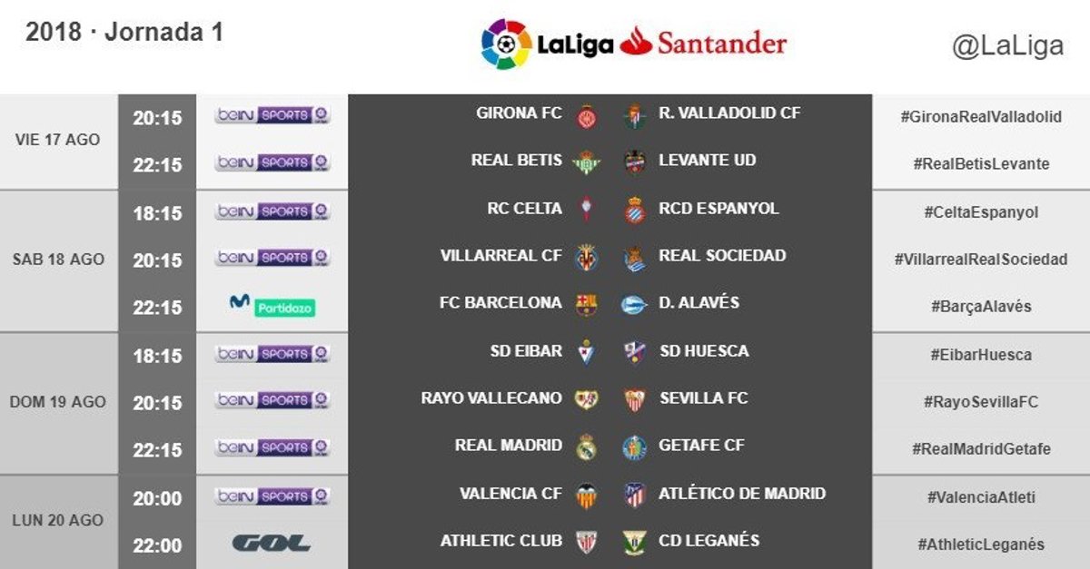 Así, la Liga arrancará el viernes 17 con dos partidos y el sábado 18 debutará el vigente campeón, el Barcelona, en casa frente al Alavés a las 22.15 horas. Para el domingo quedará el estreno del Real Madrid, que recibirá a las 22.15 al Getafe, mientras que el Atlético de Madrid arrancará el lunes en Mestalla frente al Valencia a las 20.00.