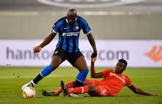 El jugador del Inter de Milán Romelu Lukaku pelea por un balón con el futbolista del Bayer Leverkusen Edmond Tapsoba - Marius Becker/dpa