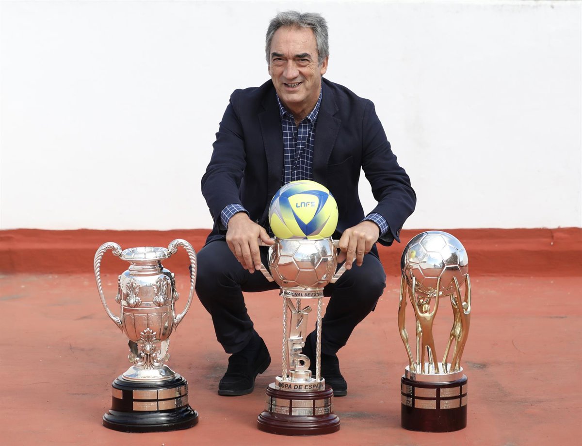 El presidente de la Liga Nacional de Fútbol Sala, Javier Lozano Cid, posa para Europa Press con el balón oficial de la Liga Nacional Fútbol Sala (LNFS), el trofeo de la LNFS, la Copa del Rey y la Copa de España - Marta Fernández - Europa Press