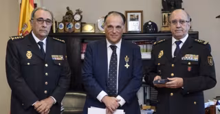 El presidente de LaLiga, Javier Tebas, ha recibido este martes la Medalla al Mérito Policial con Distintivo Blanco, otorgada por el Ministerio del Interior a través del Cuerpo Nacional de Policía, de manos del Comisario General de Seguridad Ciudadana, Florentino Villabona Javier Tebas.