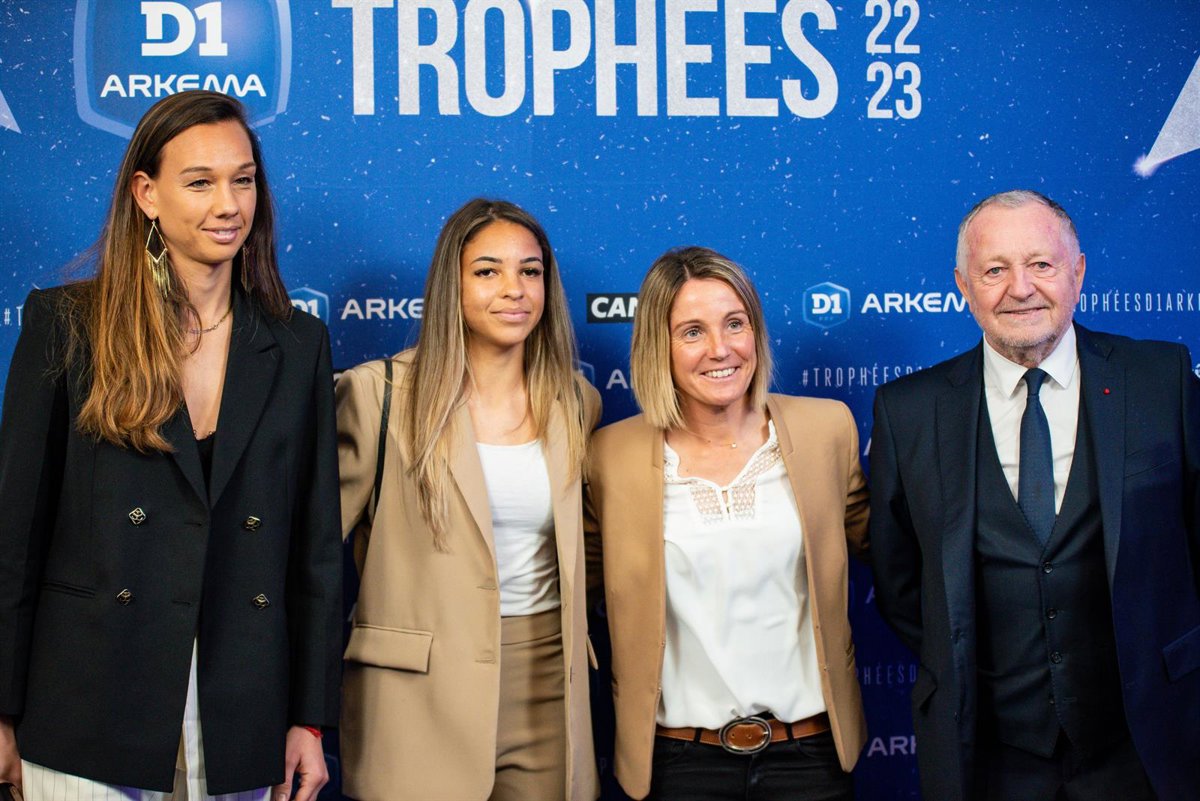 Archivo - Jean Michel Aulas junto a las jugadoras del Olympique de Lyon Christiane Endler y Delphine Cascarino, y la entrenadora Sonia Bompastor - Melanie Laurent / A2m Sport Cons / Afp7 / Europa P