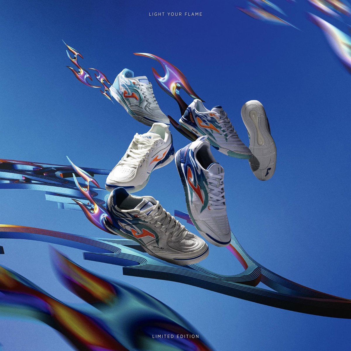 Con el lema 'Light your flame' ('Enciende tu llama'), esta línea combina innovación tanto en estética como en tecnología. La llama azul plasmada sobre el upper es símbolo de la energía y la explosividad del fútbol sala, dos aspectos que Joma quiere transmitir a los jugadores que las calcen.