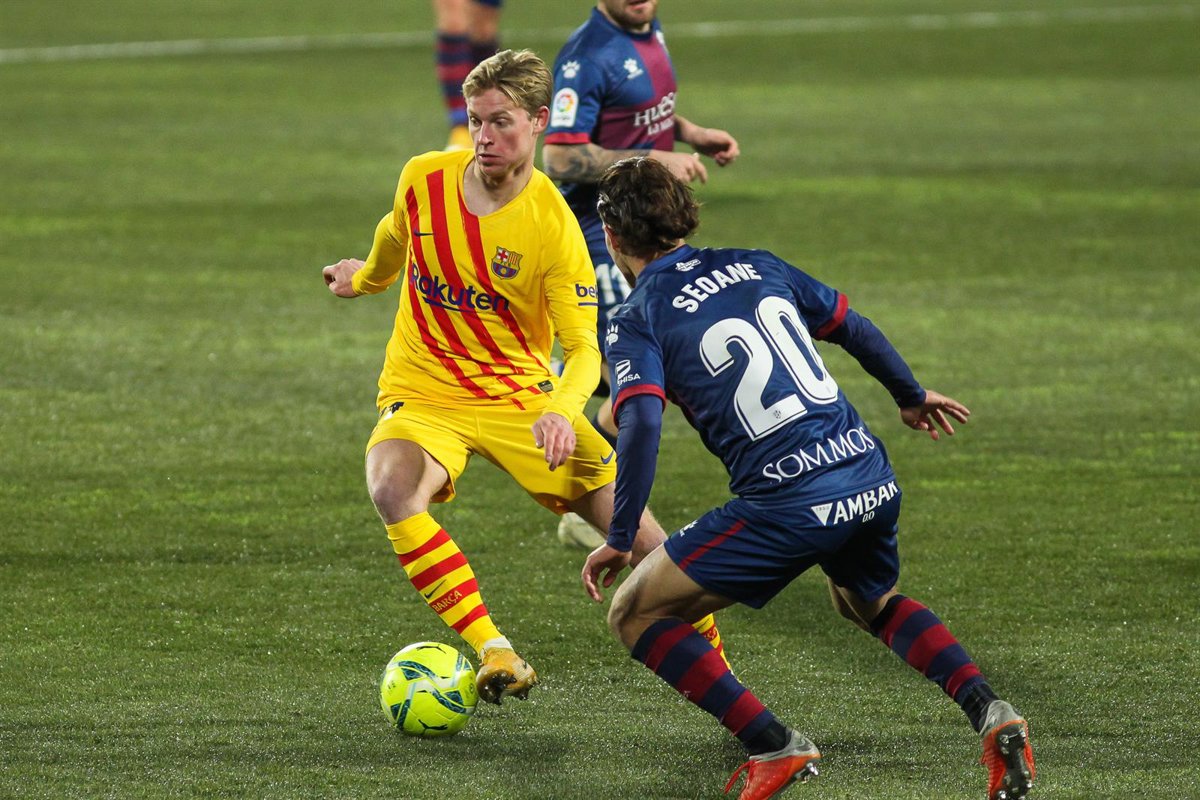 Frenkie de Jong of FC Barcelona and Jaime Seoane of SD Huesca in action during La Liga football match played between SD Huesca and FC Barcelona at El Alcoraz stadium on January 03, 2021 in Huesca, Spain. - Irina R. Hipolito/AFP7 / Europa Press