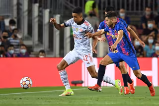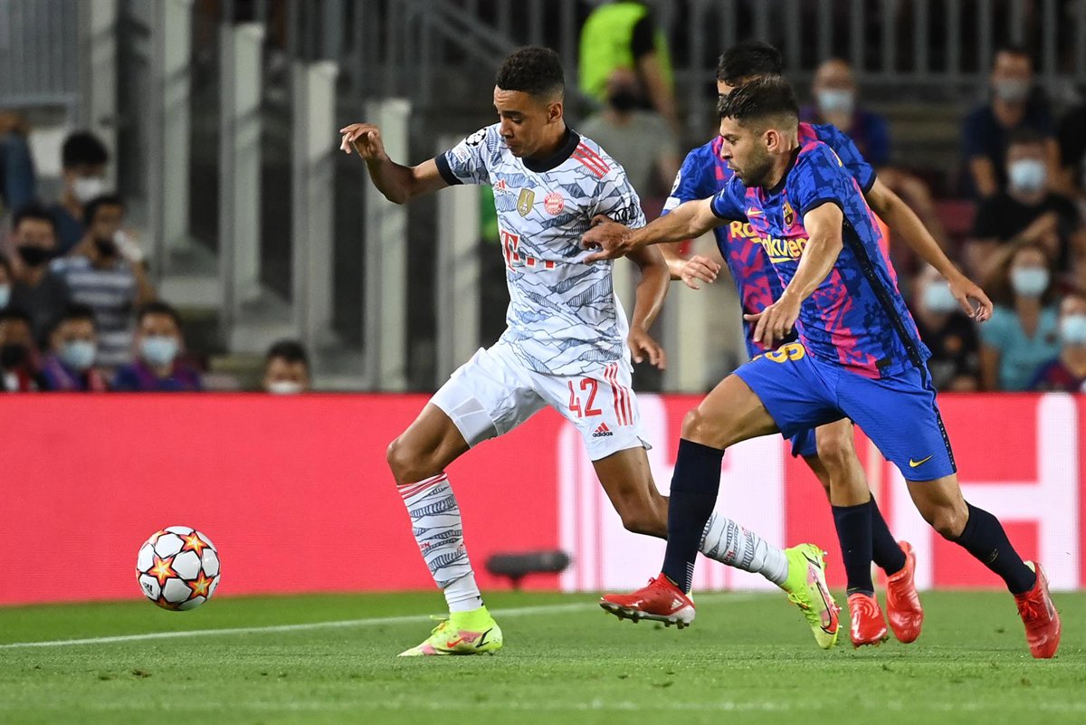 Jordi Alba persigue a Musiala en un lance del FC Barcelona-Bayern Múnich de la Liga de Campeones 2021-2022 - Sven Hoppe/dpa