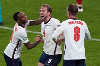 Raheem Sterling, Harry Kane y Jordan Henderson celebran un gol en el Inglaterra-Dinamarca - Mike Egerton/PA Wire/dpa