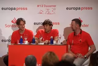Julio Salinas participó este viernes junto a la exjugadora de balonmano Eli Pinedo, el exjugador de voleibol Rafa Pascual y el exwaterpolista Pedro García Aguado en la presentación del reto 'Mi Primer Maratón' del Banco Santander, que llevará a los cuatro a correr este domingo el Maratón de Sevilla.