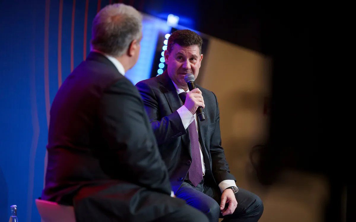 Eduard Romeu en su despedida como vicepresidente económico del FC Barcelona, con el presidente del club, Joan Laporta, de espaldas - FCB