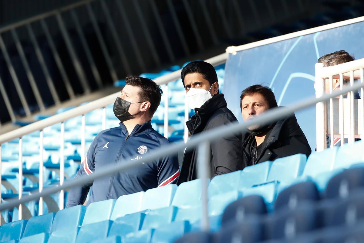 Nasser Al-Khelaifi en el palco del Santiago Bernabéu junto a Mauricio Pochettino y Leonardo - Oscar J. Barroso / AFP7 / Europa Press