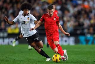Peter Federico pelea por un balón en un partido del Valencia ante el Sevilla de LaLiga EA Sports 23-24 - Ivan Terron / AFP7 / Europa Press