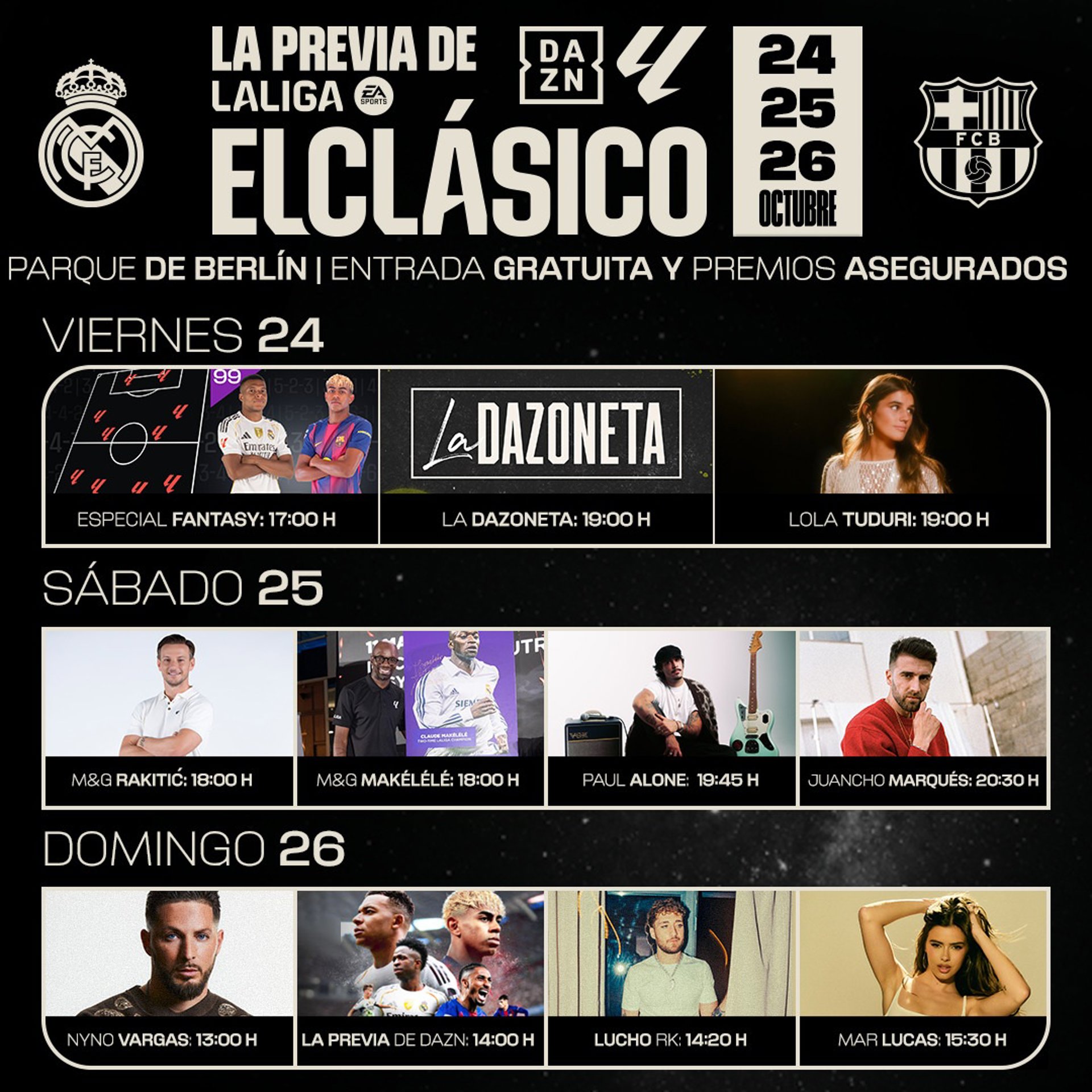 LaLiga y DAZN celebrarán del 24 al 26 de octubre 'La previa de el Clásico', un evento gratuito que transformará el Parque de Berlín en el punto de encuentro para los amantes del fútbol, la música y la cultura urbana, y que contará con la presencia de Mar Lucas, Nyno Vargas, Juancho Marqués o las leyendas Ivan Rakitic y Claude Makélélé.