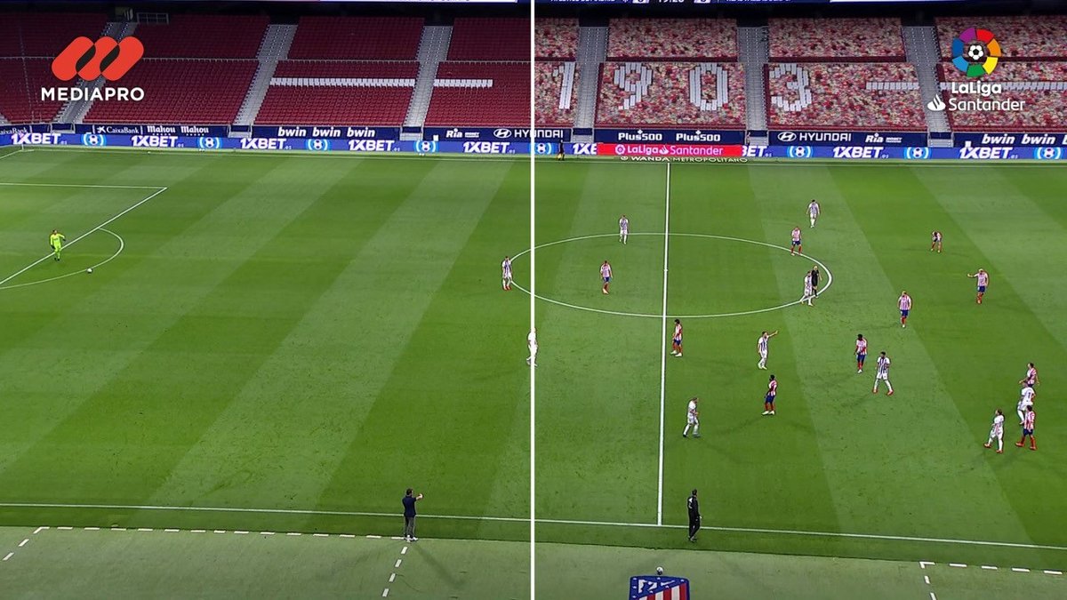 Imagen partida de una retransmisión de un partido del Atlético en el Wanda Metropolitano con y sin la grada virtual de LaLiga y MEDIAPRO - LALIGA