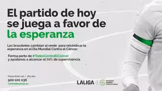 LaLiga renueva su adhesión a la iniciativa de la Asociación Española Contra el Cáncer (AECC) 'Brazaletes de esperanza', para seguir visibilizando la enfermedad y elevar la tasa de supervivencia al cáncer al 70% para 2030, según un comunicado.