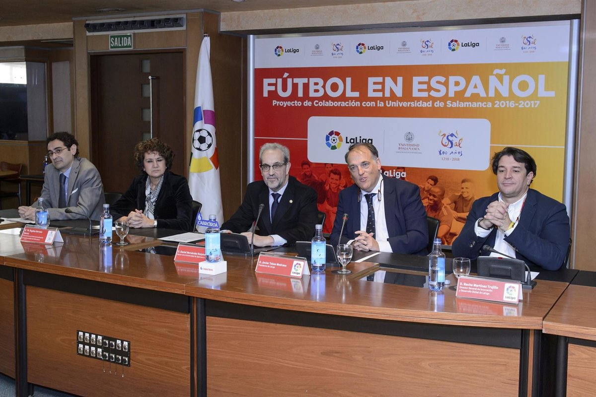 Para Tebas, este convenio es un "honor" ya que une "fútbol y cultura" y calificó el nivel de la Universidad de Salamanca como "top". "Hace cinco siglos los españoles llegaron a América y llevaron el español, ahora tenemos que llegar de otra forma y el fútbol puede ayudarnos. El compromiso con la Universidad es pleno, esto es hacer España", señaló.