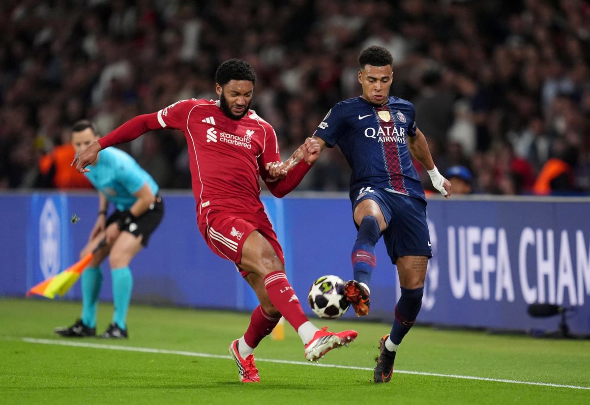 Desiré Doue (PSG) junto a Joe Gomez (Liverpool) en el encuentro de ida. - Adam Davy/PA Wire/dpa