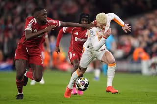 El jugador del Liverpool Ibrahima Konate lucha un balón ante el del Galatasaray Barış Alper Yılmaz en un partido de la Champions League. - Martin Rickett/PA Wire/dpa