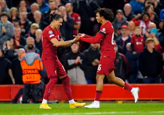 Darwin Núñez celebra con Trent Alexander-Arnold el 1-0 en el Liverpool-Rangers de la Liga de Campeones 2022-2023 - Martin Rickett/PA Wire/dpa