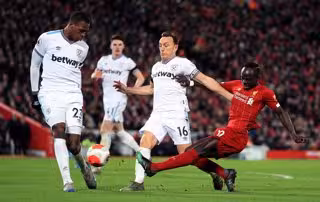 El jugador del Liverpool Sadio Mané ante los futbolistas del West Ham United Mark Noble e Issa Diop - Peter Byrne/PA Wire/dpa
