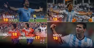 Así Luis Suárez iguala a Hernán Crespo (19 goles con Argentina) y supera a otros jugadores ilustres como Marcelo Salas e Iván Zamorano, con 18 y 17 goles, respectivamente, con Chile, y su compañero en el FC Barcelona Lionel Messi, que lleva 16 goles con Argentina. El delantero uruguayo debutó con la selección en 2007 y también es su máximo goleador histórico, con 47 goles.