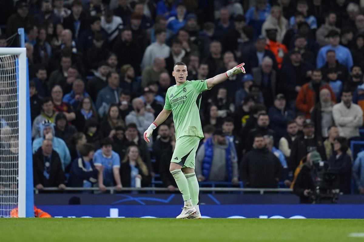 El portero del Real Madrid Andriy Lunin, ante el Manchester City en la Champions 2025-26. - Dennis Agyeman / AFP7 / Europa Press