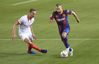Archivo - 04 October 2020, Spain, Barcelona: Barcelona's Jordi Alba (R) and Sevilla's Luuk de Jong battle for the ball during the Spanish Primera Division soccer match between Barcelona and Sevilla at the Camp Nou stadium. Photo: Supa/DAX via ZUMA Wire - Supa/DAX via ZUMA Wire/dpa - Archivo