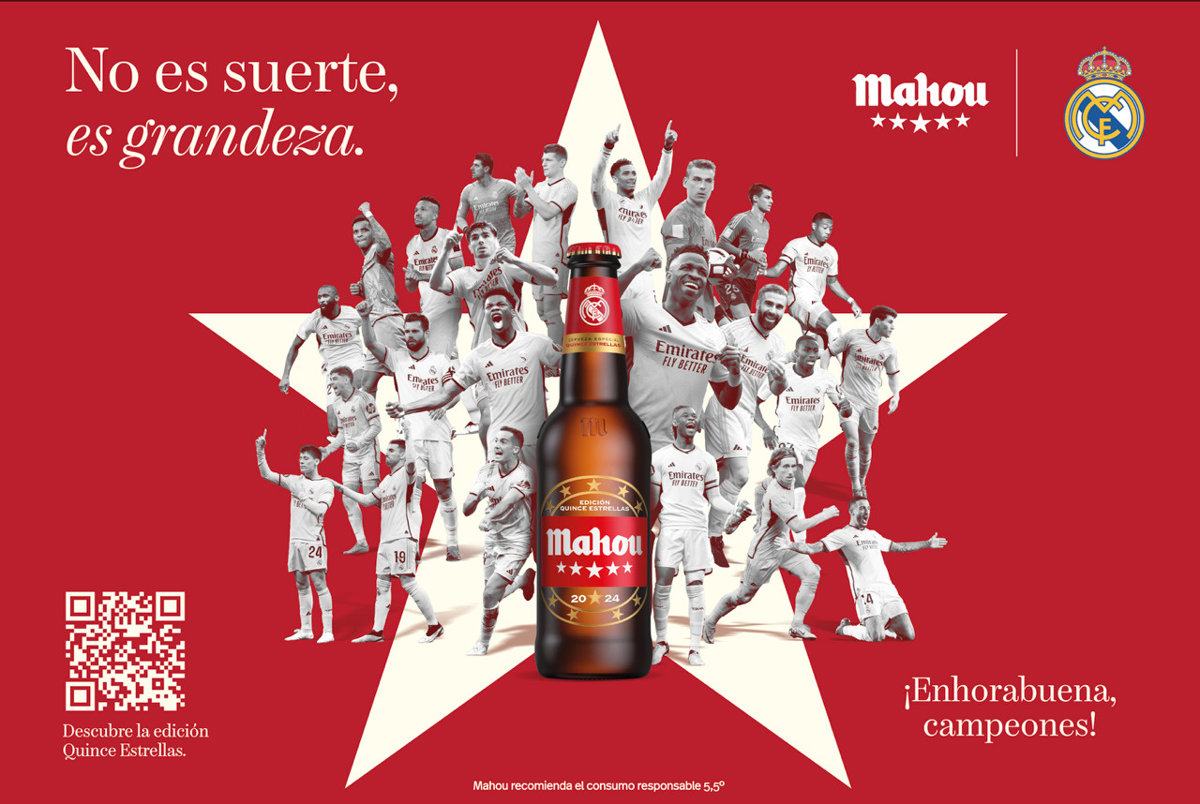 El Real Madrid se proclamó el pasado sábado campeón de la Liga de Campeones por decimoquinta vez, motivo por el que Mahou ha querido hacer un homenaje al club blanco cambiando la etiqueta de su buque insignia, Mahou Cinco Estrellas, colocando por primera vez 15 estrellas en su logo.