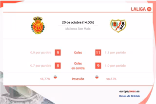 En el apartado ofensivo, el equipo vallecano supera al bermellón en goles por partido, con 1,2 goles por encuentro del primero frente a 1 del segundo. En cuanto a la calidad de las ocasiones de gol generadas, ocurre lo contrario y los mallorquinistas superan al Rayo con 0,9 goles esperados frente a 0,8, según las estadísticas de Driblab consultadas por Europa Press.