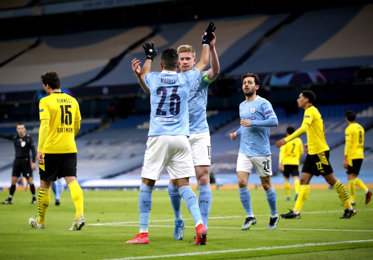 De Bruyne celebra con Mahrez el 1-0 en el Manchester City-Borussia Dortmund de la ida de cuartos de la Liga de Campeones 2020-2021 - Nick Potts/PA Wire/dpa