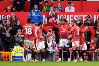 01 December 2024, United Kingdom, Manchester: Manchester United's Marcus Rashford (C) celebrates scoring his side's third goal with teammates, during the English Premier League soccer match between Manchester United and Everton at Old Trafford stadium. - Martin Rickett/PA Wire/dpa