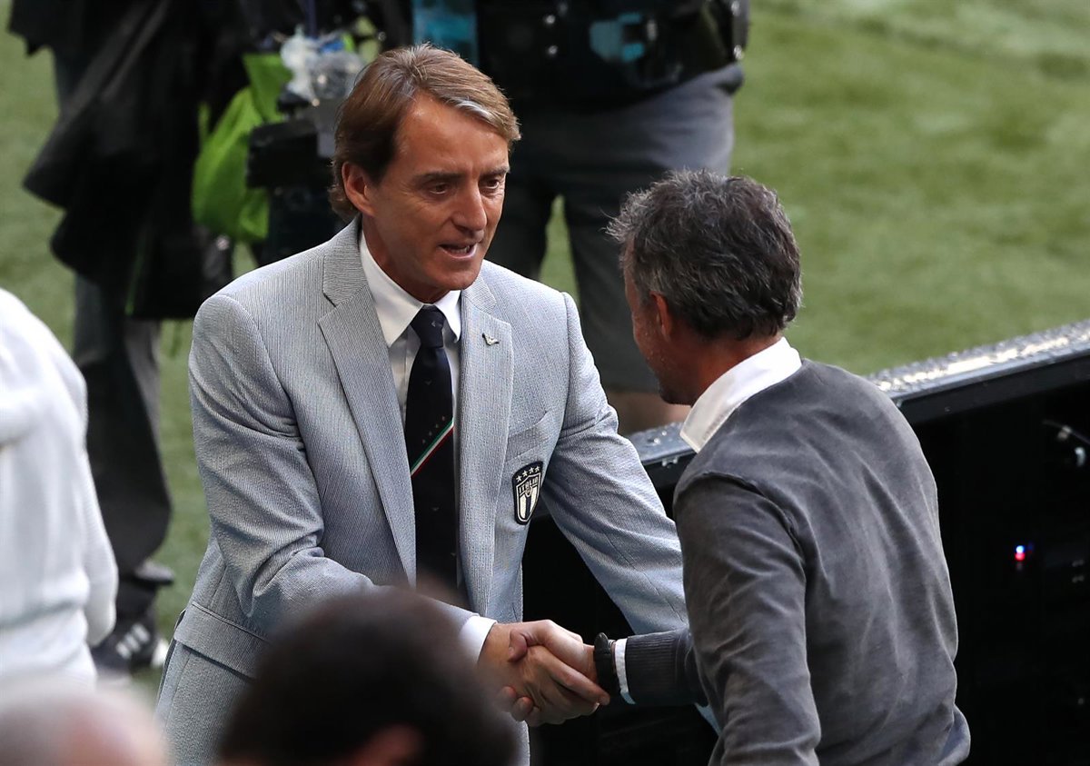 Archivo - Roberto Mancini y Luis Enrique se saludan antes de las semifinales de la Eurocopa 2020 en Wembley - Nick Potts/PA Wire/dpa - Archivo