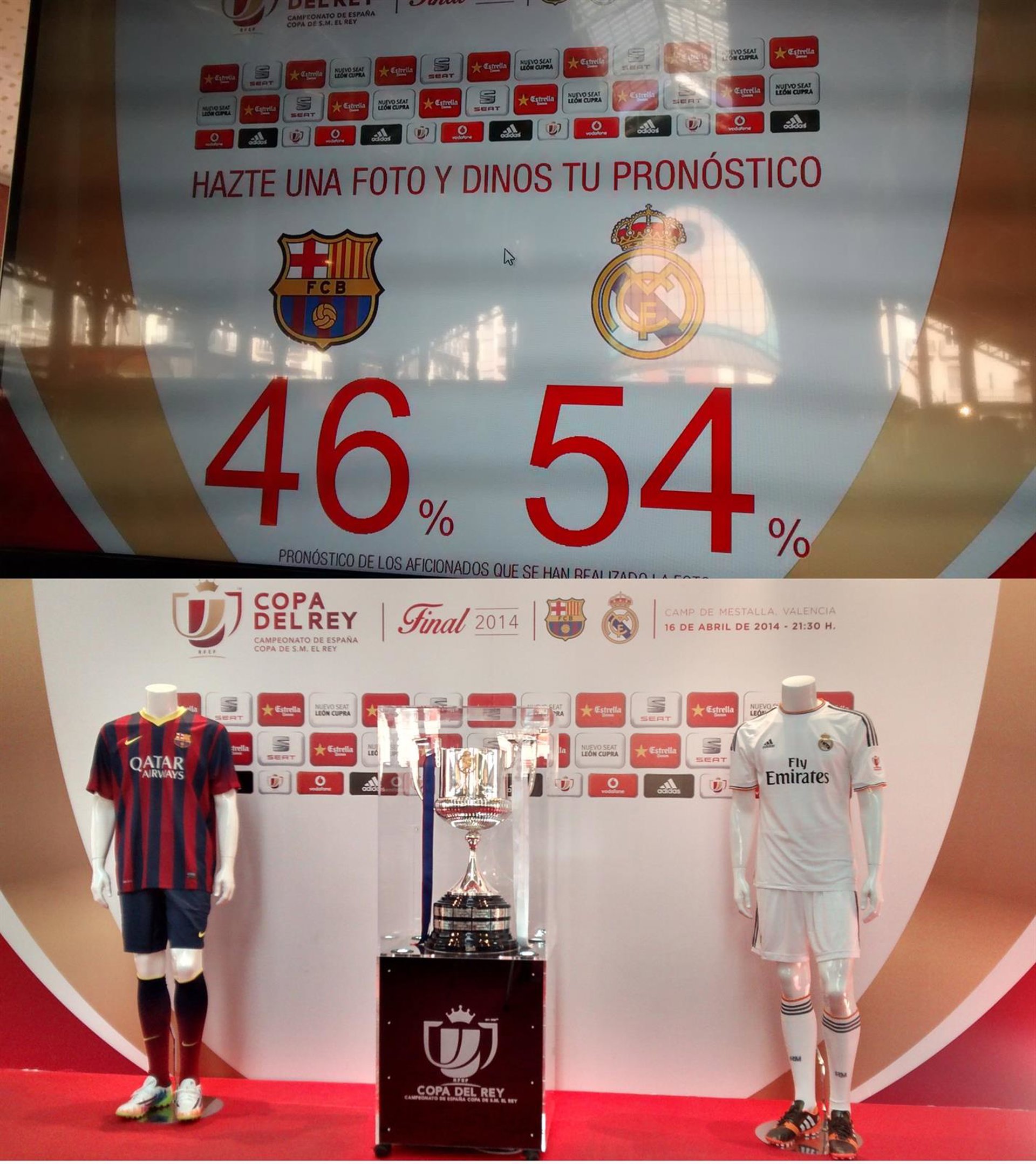 El Mercado de Colón de Valencia acoge desde el pasado viernes una exposición sobre la historia de la competición cuya joya es el trofeo de la Copa, por la que han pasado para fotografiarse con ella más de 3.000 aficionados para después hacer una porra que de momento está pareja, pero más blanca que blaugrana con motivo de la final de la Copa del Rey, que se disputa este miércoles en Mestalla (Valencia) entre FC Barcelona y Real Madrid.