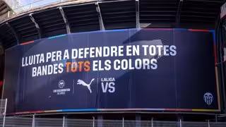 El Estadio de Mestalla luce desde este viernes una nueva lona en su fachada con la que el Valencia CF, PUMA y LaLiga pretenden mostrar su posicionamiento claro en contra del racismo y de cualquier forma de discriminación con el mensaje 'Lluita per a defendre en totes bandes todos els colors' -'Lucha para defender en todos lados todos los colores'-.
