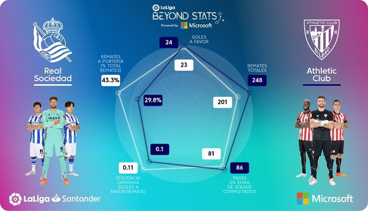El derbi vasco que medirá este sábado a la Real Sociedad y el Athletic Club centrará gran parte de la decimoséptima jornada de LaLiga Santander 2022-2023 y por ello LaLiga ofrece algunas de las métricas destacadas a tener en cuenta a través de 'Beyond Stats', el proyecto conjunto de estadísticas avanzadas que tiene junto a 'Microsoft' y que se obtienen gracias a la plataforma 'Mediacoach'.