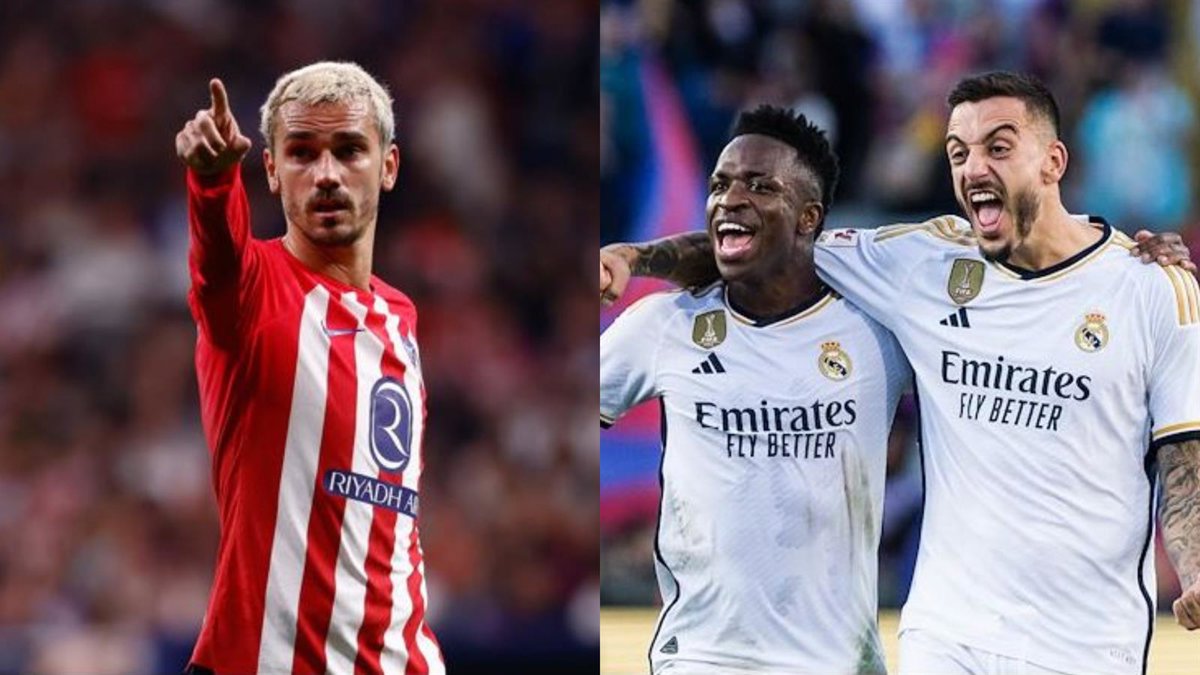El jugador del Atlético de Madrid Anotine Griezmann y los jugadores del Real Madrid Vinícius Júnior y Joselu Mato. - EUROPA PRESS