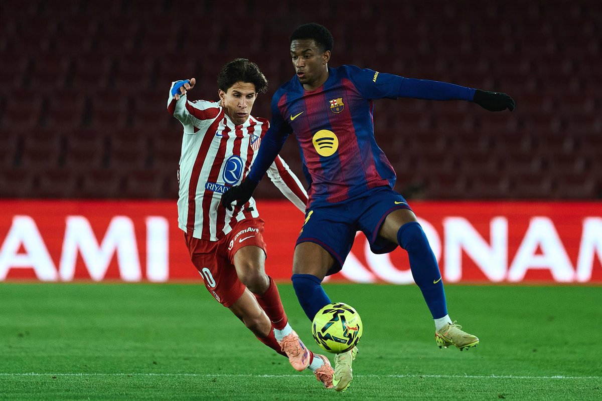 Archivo - El jugador del FC Barcelona Alejandro Balde disputa un balón con el del Atlético de Madrid Giuliano Simeone durante un encuentro de LaLiga EA Sports. - Europa Press/Contacto/Gerard Franco - Archivo