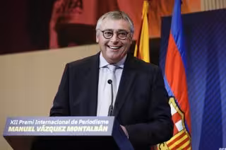 "Estoy muy abrumado. Tuve el honor de conocer a don Manuel en más de una sobremesa y me ayudó tanto que me abrumó su persona", comentó al recibir el galardón de manos del presidente del FC Barcelona, Josep Maria Bartomeu, de la viuda de Vázquez Montalbán y de la decana del Col·legi de Periodistes de Catalunya, Neus Bonet.