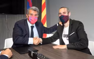 Mingueza firmó la extensión de su contrato, que incluye una cláusula de resción de 100 millones de euros, en un acto privado con el presidente blaugrana, Joan Laporta, en la Ciutat Esportiva Joan Gamper.