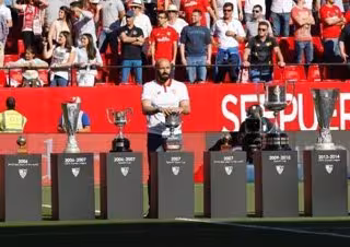 El 'León de San Fernando', que anunció su adiós el pasado 30 de marzo tras llegar a un acuerdo con el club para su salida, prosiguió su adiós con una vuelta de honor al estadio, que cantaba una y otra vez su nombre. Finalmente, Monchi se fotografió junto a los títulos conseguidos con el Sevilla en una despedida por todo lo alto.